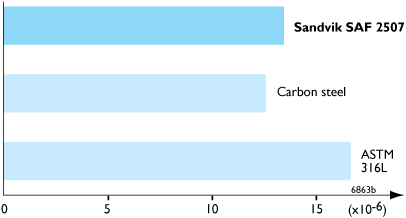 SAF™ 2507 has a coefficient of thermal expansion close to that of carbon steel. This gives SAF™ 2507 definite design advantages over austenitic stainless steels in equipment comprising both carbon steel and stainless steel. The values given below are average values in the temperature ranges.