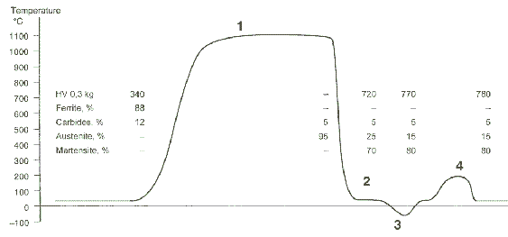During heating [1], or austenitizing, the ferrite is transformed into austenite and the carbides are partly dissolved. Because of the carbide dissolution, the contents of carbon and chromium in the matrix increase. The subsequent quenching to room temperature [2] will transform most of the austenite into martensite. During deep freezing of the material to -70°C (-94°F) [3], even more austenite is transformed into martensite. The remainder, about 15 %, is known as retained austenite. Finally, since the material is now very brittle, the toughness, and also the hardness, is increased by a tempering treatment [4].