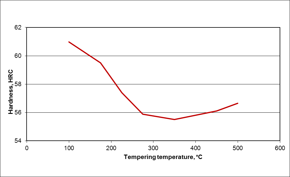 The following diagram exemplifies the tempering response for Alleima® 14C28N®. More detailed hardening data can be found in the Alleima hardening guide.