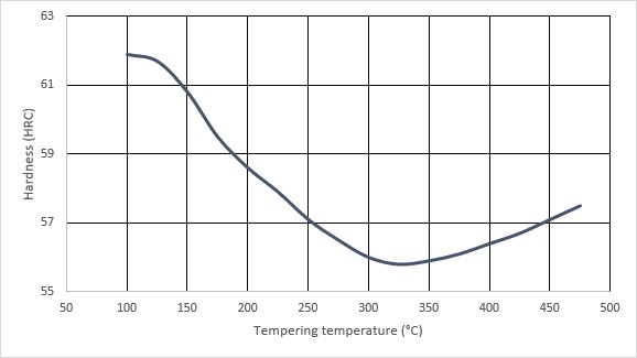 Below is an estimation of the hardness levels that can be expected with different tempering temperatures.