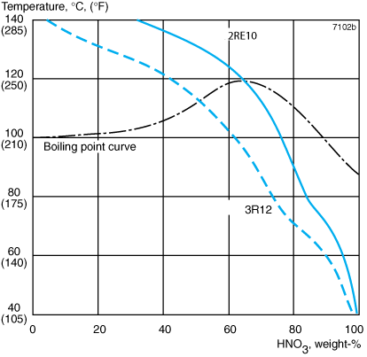 Figure 1. Isocorrosion diagram for Alleima® 2RE10 and 3R12 (ASTM304L) in a naturally aerated, stagnant solution of nitric acid. The curves represent a corrosion rate of 0.1 mm/year (4 mpy).