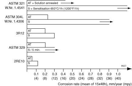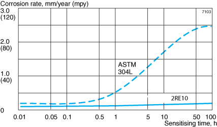 In delivery testing, by means of the Huey test, the guaranteed maximum corrosion rate for Alleima® 2RE10 is 0.12 mm/year (5 mpy) in the solution annealed condition, and 0.20 mm/year (8 mpy) after sensitization at 675°C (1250°F). Even lower values can be guaranteed by agreement in certain cases. Figure 3 demonstrates that sensitization does not increase the corrosion rate greatly in Huey testing, whereas the corrosion rate for ASTM 304L increases significantly.