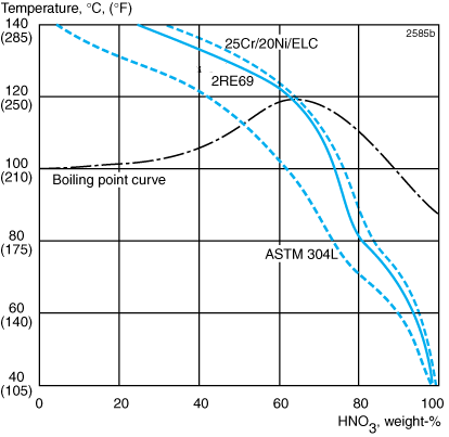 Alleima® 2RE69 is also highly resistant to inorganic acids, as illustrated by the iso-corrosion diagram for nitric acid, Figure 1.