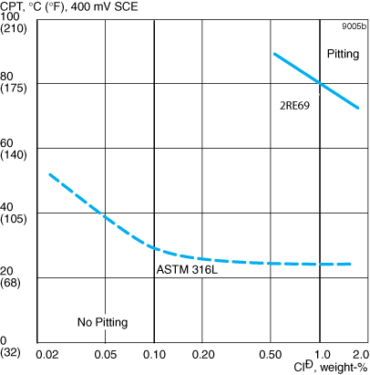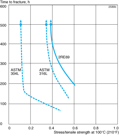 Conventional austenitic stainless steels of type ASTM 304 and 316 are susceptible to stress corrosion cracking (SCC) in chloride-bearing solutions at temperatures exceeding about 60°C (140°F). The higher nickel content makes Alleima® 2RE69 slightly more resistant, as assessed in laboratory tests, see Figure 4.