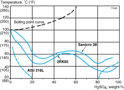The steel was originally developed for use in sulfuric acid. Its good resistance is achieved by virtue of a high molybdenum content and alloying with copper. Figure 1 is an isocorrosion diagram for Alleima® 2RK65, Sanicro® 28 and ASTM 316L in deaerated sulfuric acid.
