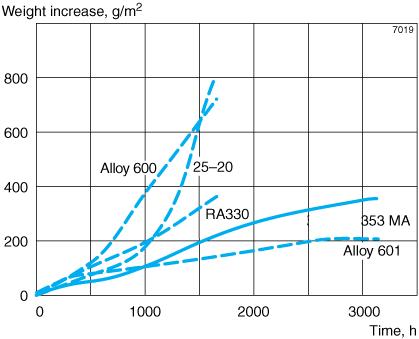 Owing to the high silicon content and the addition of rare earth metals (REM), Alleima® 353 MA has very high resistance to oxidation. The REM addition also contributes to improved scale adhesion during temperature cycling. Figure 1, which shows the measured weight increase after 45 h cyclic oxidation at different temperatures, illustrates how Alleima® 353 MA compares with some other high temperature grades. Weight increase after longer exposure at 1150°C (2100°F) is shown in Figure 2. The weight increase shown in Figure 1 and Figure 2 includes the weight of any spalled oxide.