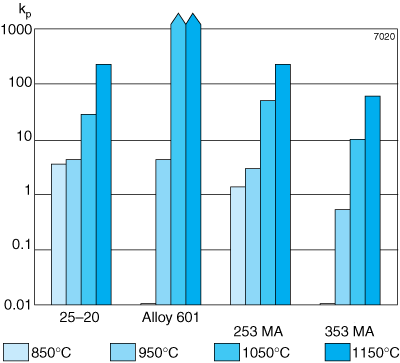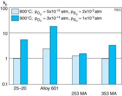 Alloys with high nickel content are generally sensitive to attack by sulphur at higher temperatures. However, under oxidizing conditions a protective oxide will be able to form, contributing to an improved resistance to sulphur attack. This is illustrated in Figure 6, which shows the rate constant for different alloys in different sulphidizing-oxidizing conditions. Again, the dense oxide formed on Alleima® 353 MA is shown to be advantageous.