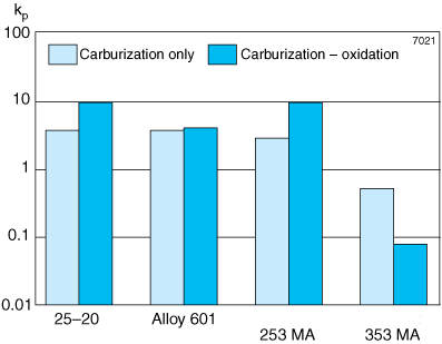 Figure 3 shows the measured rate constants for carburization tests of various alloys at different temperatures. Cyclically carburizing-oxidizing conditions are often more detrimental, but, as Figure 4 shows, Alleima® 353 MA is able to resist these conditions better than other alloys.