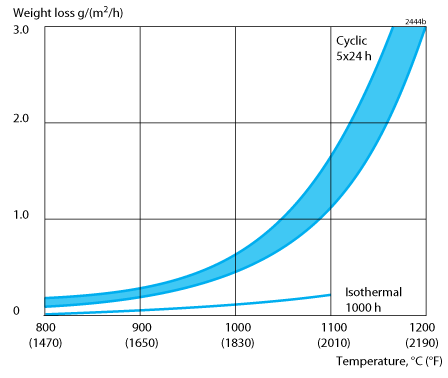 Cyclic oxidation at 1100°C (2010°F) for 5 x 24 h, with cooling to room temperature every 24 hours, gives a weight loss of less than 1.5 g /m2 h after removal of the oxide layer.