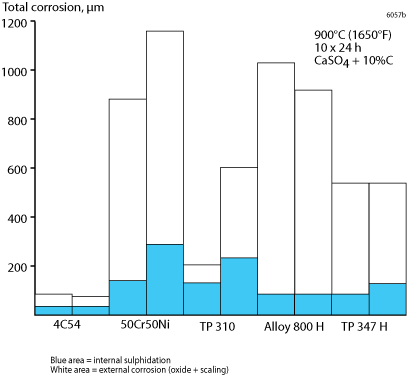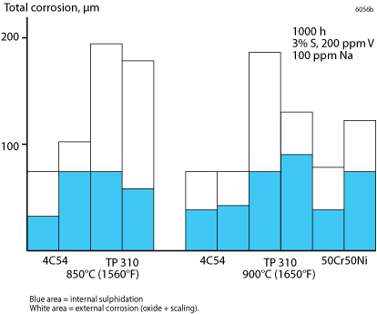 Owing to its high chromium content and the absence of nickel, Alleima® 4C54 has very good resistance in sulphidizing gases and salts. The steel has relatively good resistance to slags containing vanadium pentoxide and sodium sulphate, for example, which are extremely aggressive at temperatures above 600°C (1110°F). The results of a corrosion test in combustion gases from heavy oil show that Alleima® 4C54 possesses better resistance than 50Cr50Ni alloy and austenitic high temperature steels in such environments (see Fig. 3).