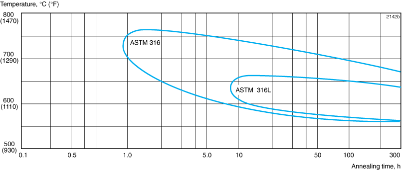 Pressurfect® CNG has a low carbon content and therefore better resistance to intergranular corrosion than steels of type ASTM 316. The TTC-diagram, Figure 1, shows the result of corrosion testing for 24 hours in boiling Strauss solution (12% sulfuric acid, 6% copper sulfate). The resistance to grain boundary attack is much better for ASTM 316L than for ASTM 316. This is an advantage in complicated welding operations.