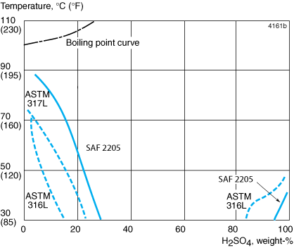 Figure 3. Iso- corrosion diagram for SAF™ 2205, ASTM TP316L and ASTM TP317L in sulphuric acid. The curves represent a corrosion rate of 0.1 mm/year (4 mpy) in a natural aerated stagnant test solution.