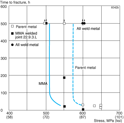 Figure 9 shows the results of stress corrosion cracking tests at room temperature in NACE TM 01777 test solution A with hydrogen sulphide. The high resistance of SAF 2205™ is shown in the figure by the fact that very high stresses, about 1.1 times the 0.2% proof strength, are required to induce stress corrosion cracking. The resistance of welded joints is slightly lower. The ferritic chromium steel ASTM 410 fails at considerably lower stress.
