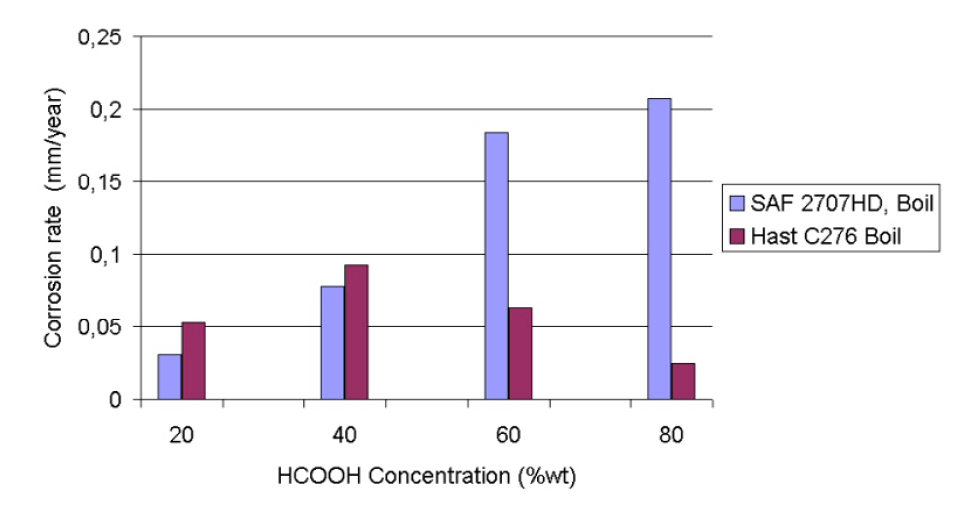Figure 4. Corrosion rates of SAF™ 2707 HD and Hastelloy C276 in boiling formic acid at various concentrations.