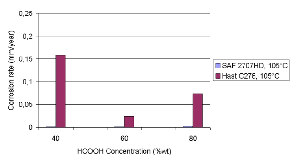 Figure 3. General corrosion resistance of SAF™ 2707 HD and Hastelloy C276 in various concentrations of formic acid at 105°C.