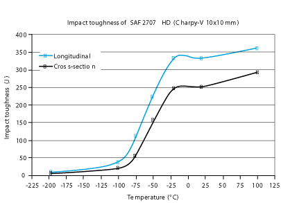SAF™ 2707 HD possesses very good impact strength. Figure 1 shows impact energy (KCV). The ductile-brittle transition temperature is below -50°C (-58°F).