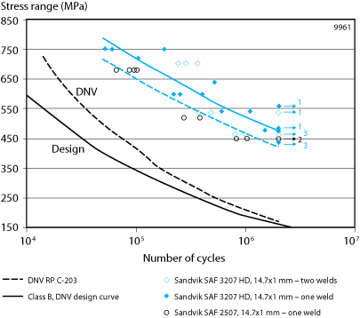 Figure2: S-N curves for Sandvik SAF 3207 HD, SAF 2507 and DNV design curves