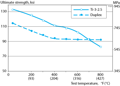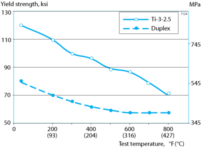 Average measured elevated temperature tensile properties of Ti-3-2.5 tubing are shown in figures 5 and 6. These graphs compare Ti-3-2.5 tubing made in the CWSR condition to a high strength duplex stainless steel (UNS S32750). Ti-3-2.5 is usable to about 800°F (427°C), above that temperature, oxidation can occur.