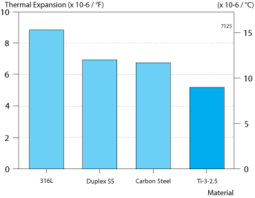 The coefficient of thermal expansion for Ti-3-2.5 in comparison to other corrosion resistant tubing alloys, is shown in figure 7.