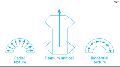 The endurance fatigue limit for Ti-3-2.5 tubing in the annealed or CWSR conditions is about 50% of the materials ultimate tensile strength. It is possible to further fatigue enhance properties by controlling the crystallographic texture of the tubing. Titanium alloys have a hexagonal crystal structure which gives the material certain anisotropic properties. Alleimas proprietary pilgering processes allows it to orient the metal crystals which make up the tubing in favorable directions. The difference in tubing textures is explained in figure 9.