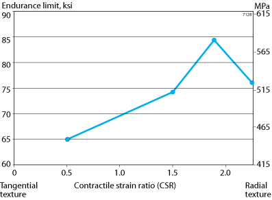 A number of studies have shown that tubing with a radial texture has better fatigue performance than tubing with a tangential texture. Crystal texture is measured by the contractile strain ratio test or CSR, with higher CSR numbers indicating more radial texture. The effect that crystal texture has on fatigue endurance limit is shown in figure 10. This data is based a series of planar flexure fatigue tests performed on 1/2" (12.7 mm) OD x 0.035" (0.9 mm) wall hydraulic tubing made to the CWSR condition.