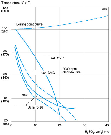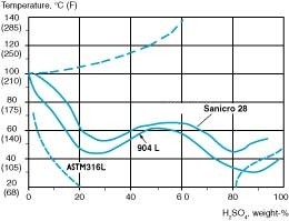 Sanicro® 28 is a suitable material for piping and heat exchangers, particularly at concentrations of between 40 and 70% of deaerated acid and over 85%. Sanicro® 28 has approximately the same resistance as Alloy C in concentrated acid (98% H2SO4).
