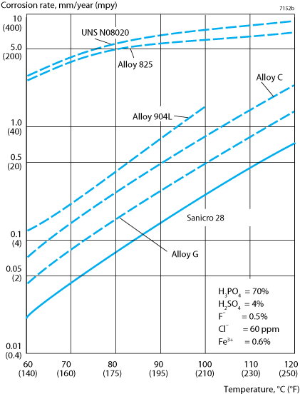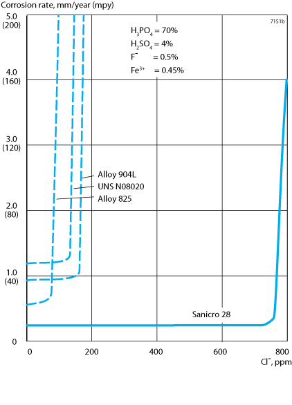 Laboratory tests at 200°C (390°F) in contaminated 95% super phosphoric acid gave the following corrosion rates after 20 days: Sanicro® 28, 0.03 mm/year (1.2 mpy); Alloy 904L, 0.10 mm/year (4.0 mpy); UNS N08020, 0.23 mm/year (9.2 mpy); Alloy G, 0.03 mm/year (1.2 mpy).