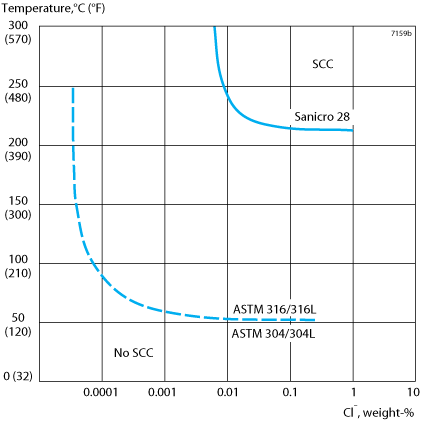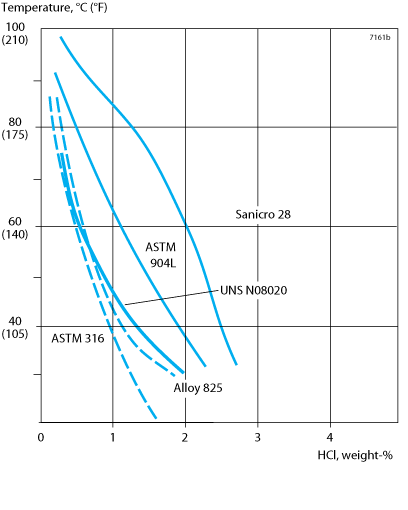 Sanicro® 28 is more resistant to hydrochloric acid than stainless steels with lower chromium and molybdenum contents and can, therefore, be used to advantage in cases where chemical process solutions are contaminated with hydrochloric acid, see isocorrosion diagram in figure 5.