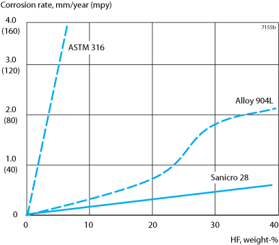 Sanicro® 28 resists hydrofluoric and hydrofluosilicic acid very well and can be used where these acids occur as impurities (see corrosion diagram for hydrofluoric acid, figure 6). Both Sanicro® 28 and AISI 316L are completely resistant to pure acetic acid at all temperatures and concentrations at atmospheric pressure. However, at elevated temperatures and pressures, AISI 316L will corrode while Sanicro® 28 will remain resistant. Acetic acid is often contaminated with formic acid, which renders it more corrosive. Laboratory tests show that Sanicro® 28 is more resistant than AISI 316 and AISI 317L in such solutions.