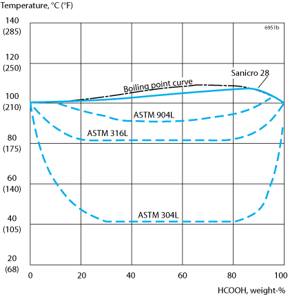 Figure 7. Isocorrosion diagram for Sanicro® 28 and other alloys in formic acid at a corrosion rate of 0.1 mm/year (4 mpy).