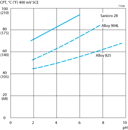 Sanicro® 28 can withstand very high temperatures in aggressive environments without being attacked by pitting. Figure 8 shows the critical pitting temperature (CPT) for some alloys in chloride-bearing water with a salinity comparable to that of sea water. The figure shows that Sanicro® 28 has a higher critical pitting temperature (CPT) than Alloy 904L and Alloy 825 even in acidic chloride solutions. The curves are displaced at higher temperatures in solutions with lower salinities.