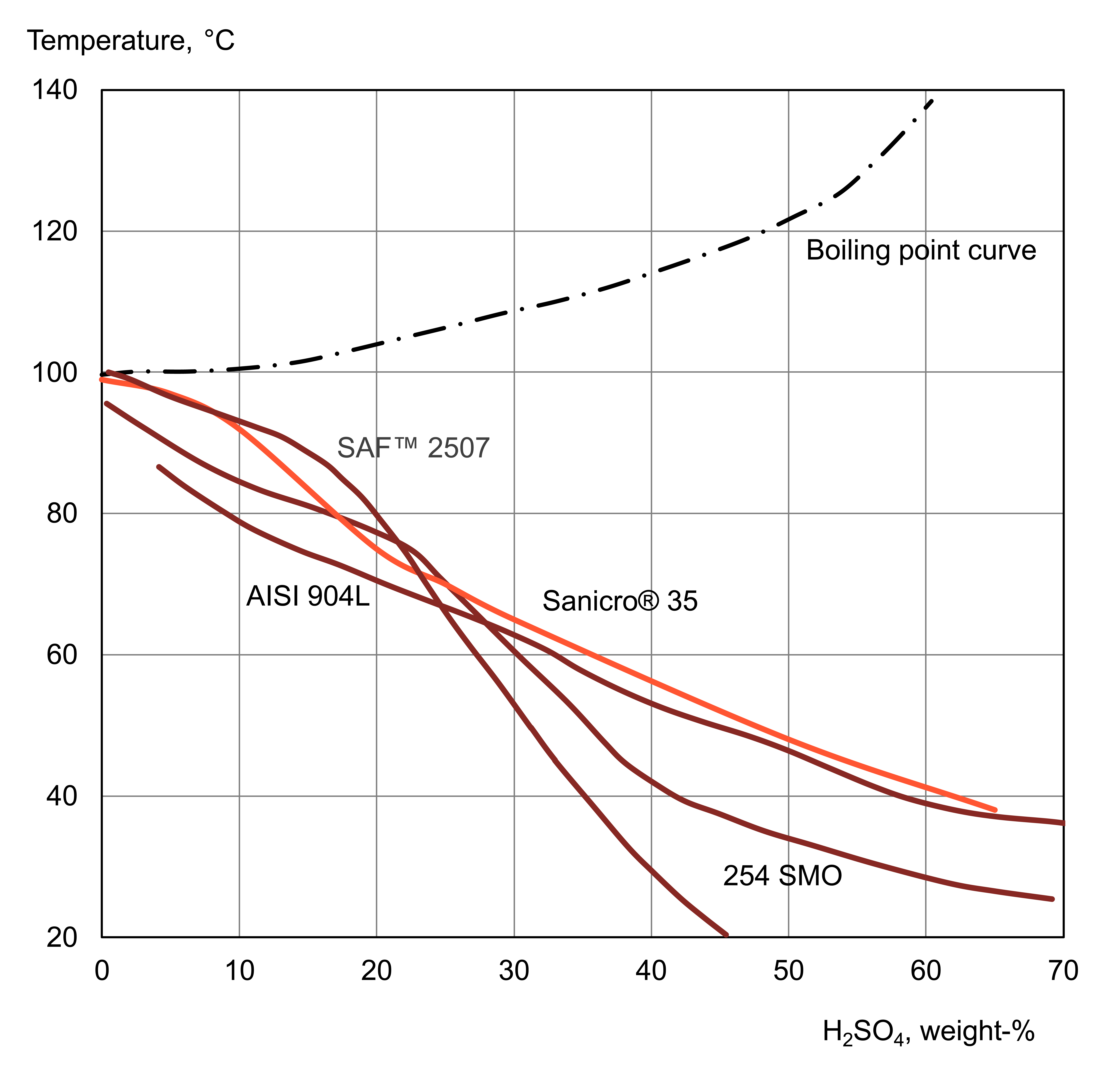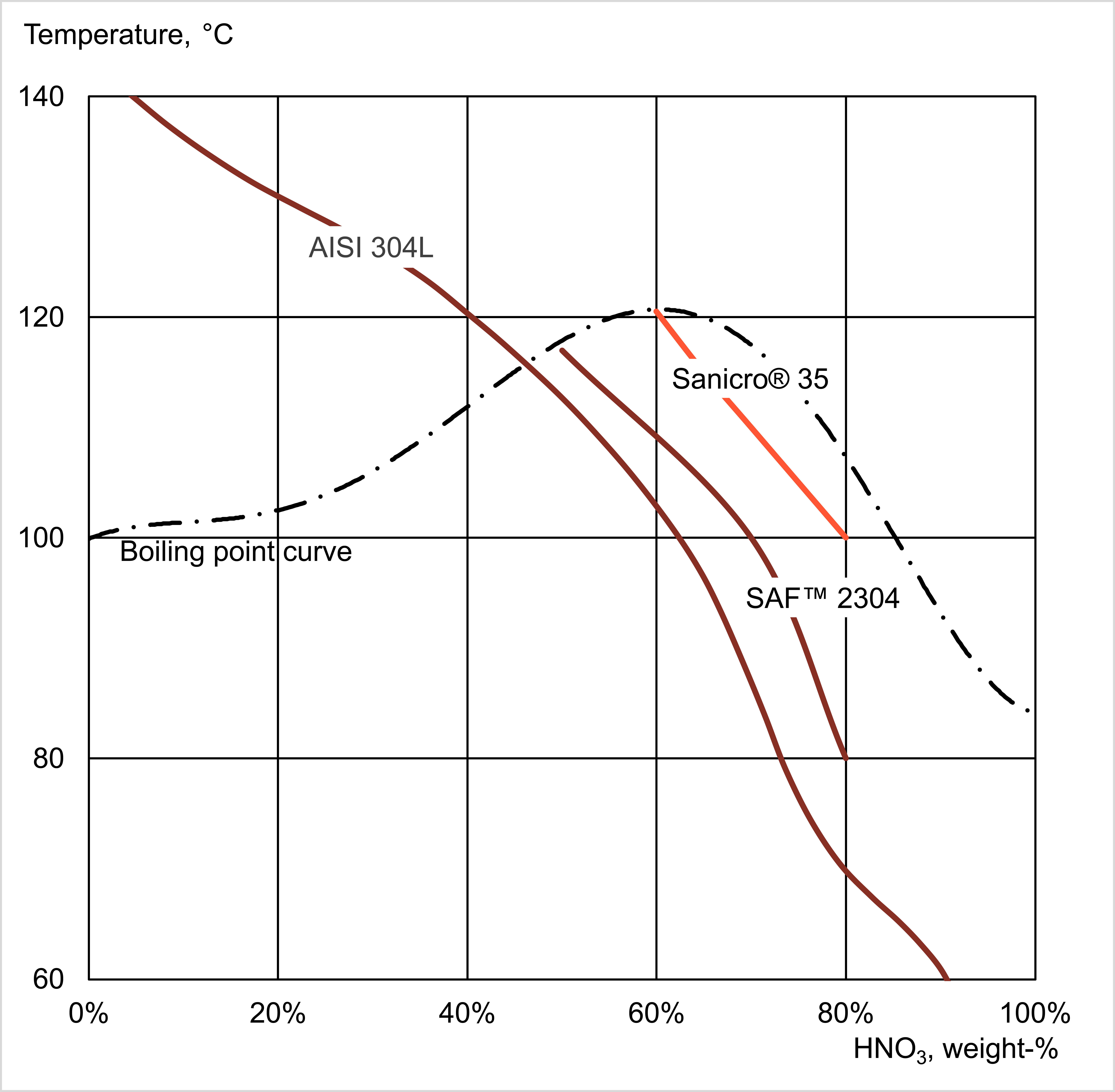 Sanicro® 35 has a high resistance to sulfuric acid and nitric acid. Isocorrosion diagrams can be seen in Figure 2 and Figure 3.