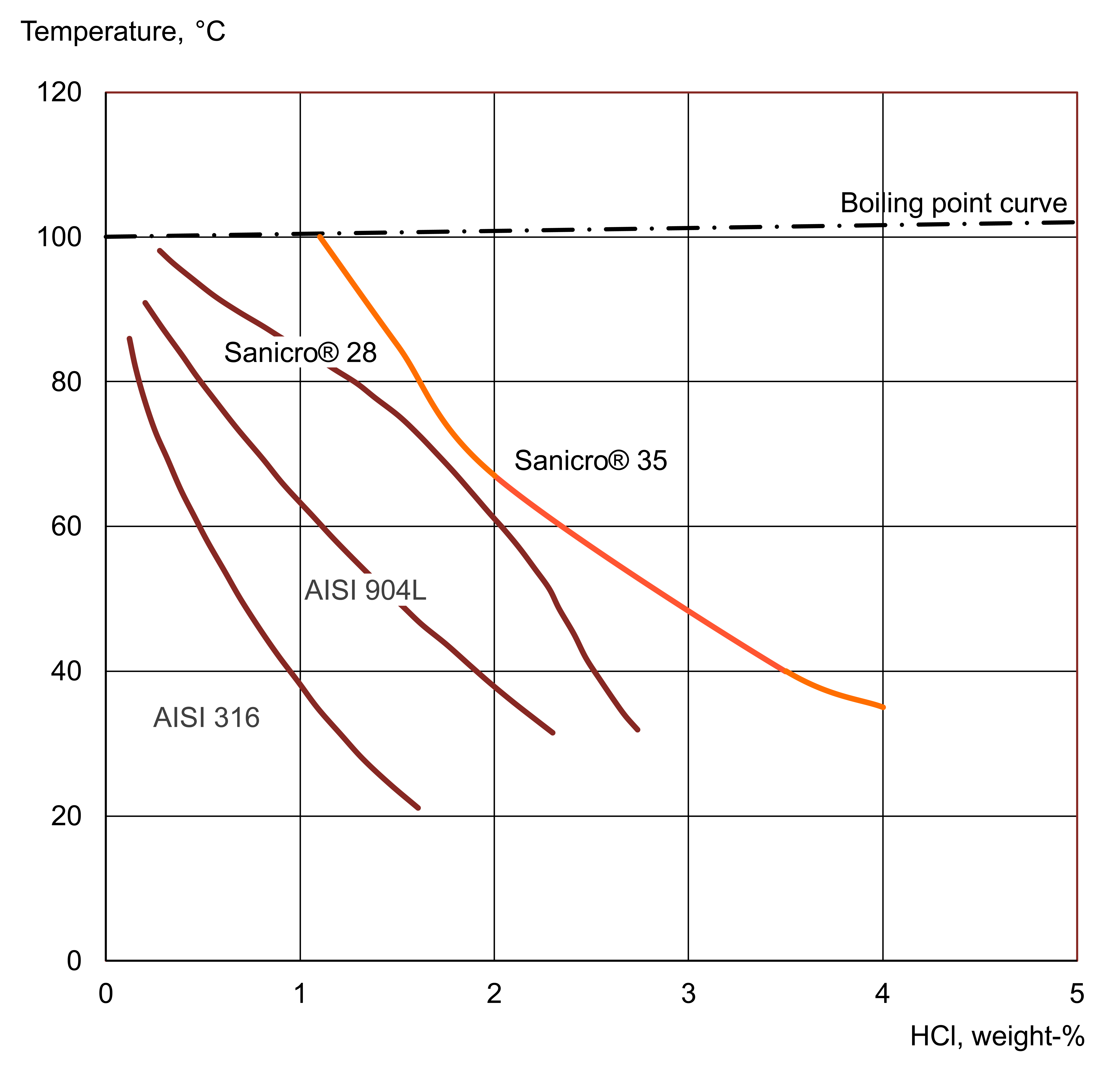 Sanicro® 35 has good resistance to hydrochloric acid compared to stainless steels with a lower chromium and molybdenum content and can, therefore, be useful in environments where hydrochloric acid is present. See Figure 1.